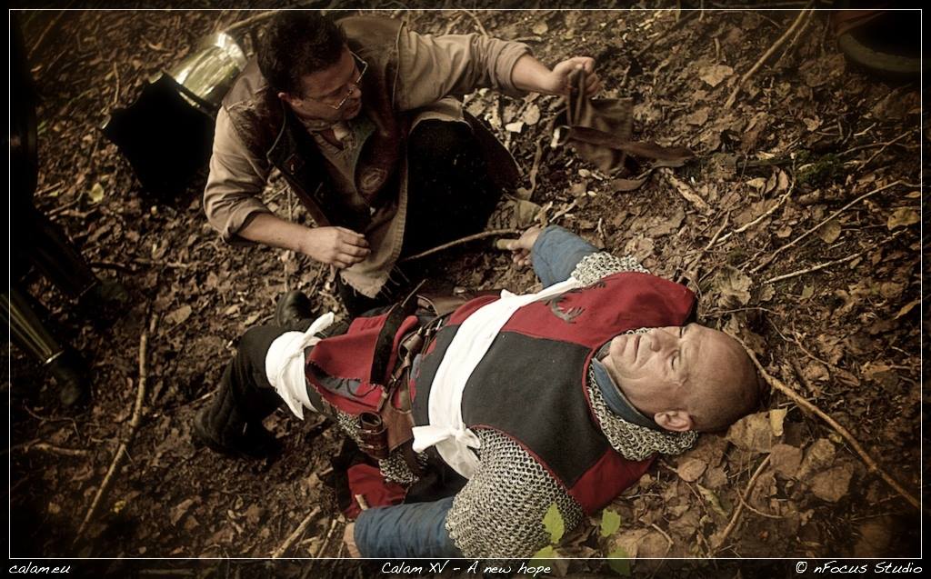 - De halfling Boddynock, een priester van Bruon, en Olaf de chirurg (niveau II) staan voorover gebogen voor het lichaam van een gewonde soldaat. De soldaat staat op -2 levenspunten. Boddynock wil de spreuk Genees Fysieke Wonde I uitspreken, maar Olaf houd hem tegen. Hij begint het slachtoffer te reanimeren waarop na enkele minuten de soldaat op 0 levenspunten komt te staan en stabiel maar bewusteloos is. Olaf biedt nog enkele minuten extra verzorging aan en daar hij niveau II chirurgie beheerst kan hij de soldaat nog eens extra levenspunten geven zodat deze op 2 komt te staan. Vervolgens spreekt Boddynock de spreuk Genees Fysieke Wonde I uit waardoor de soldaat nog eens 2 extra levenspunten krijgt en op een totaal van 4 levenspunten komt te staan.