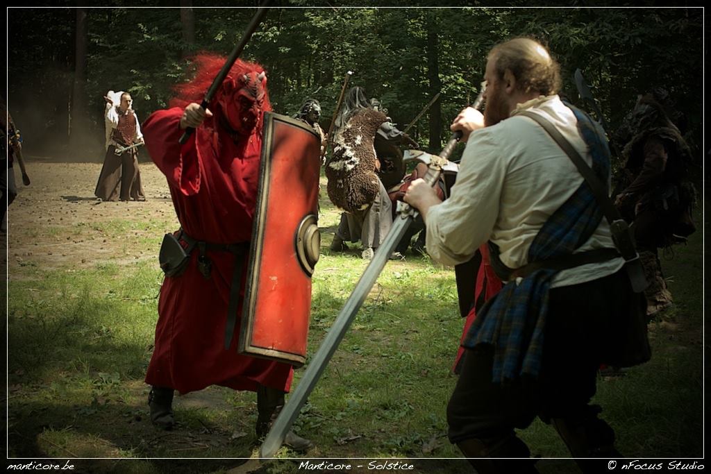 Gevechten, of het nu een duel is of een ware veldslag tussen twee legers, vormen een belangrijk onderdeel van menige Larp evenement. Vaak merken we op evenementen dat mensen de zogenaamde “tik-techniek” hanteren waarbij ze hun tegenstander een korte, kleine tik op diens hand of pols toebrengen wanneer deze wil uithalen. Ook de trommel-techniek, waar deelnemers tegen een snel tempo op elkaar inhakken, is iets wat we spijtig genoeg regelmatig opmerken. Op Manticore doen we er alles aan om dit te vermijden, want zeg nu zelf dat dit niet een leuke en heroïsche manier is om te strijden. We hameren er bij onze figuranten uiteraard op om op een realistische en heroïsche manier te vechten, en hopen dat ook de spelers hier op een positieve manier op gaan reageren.