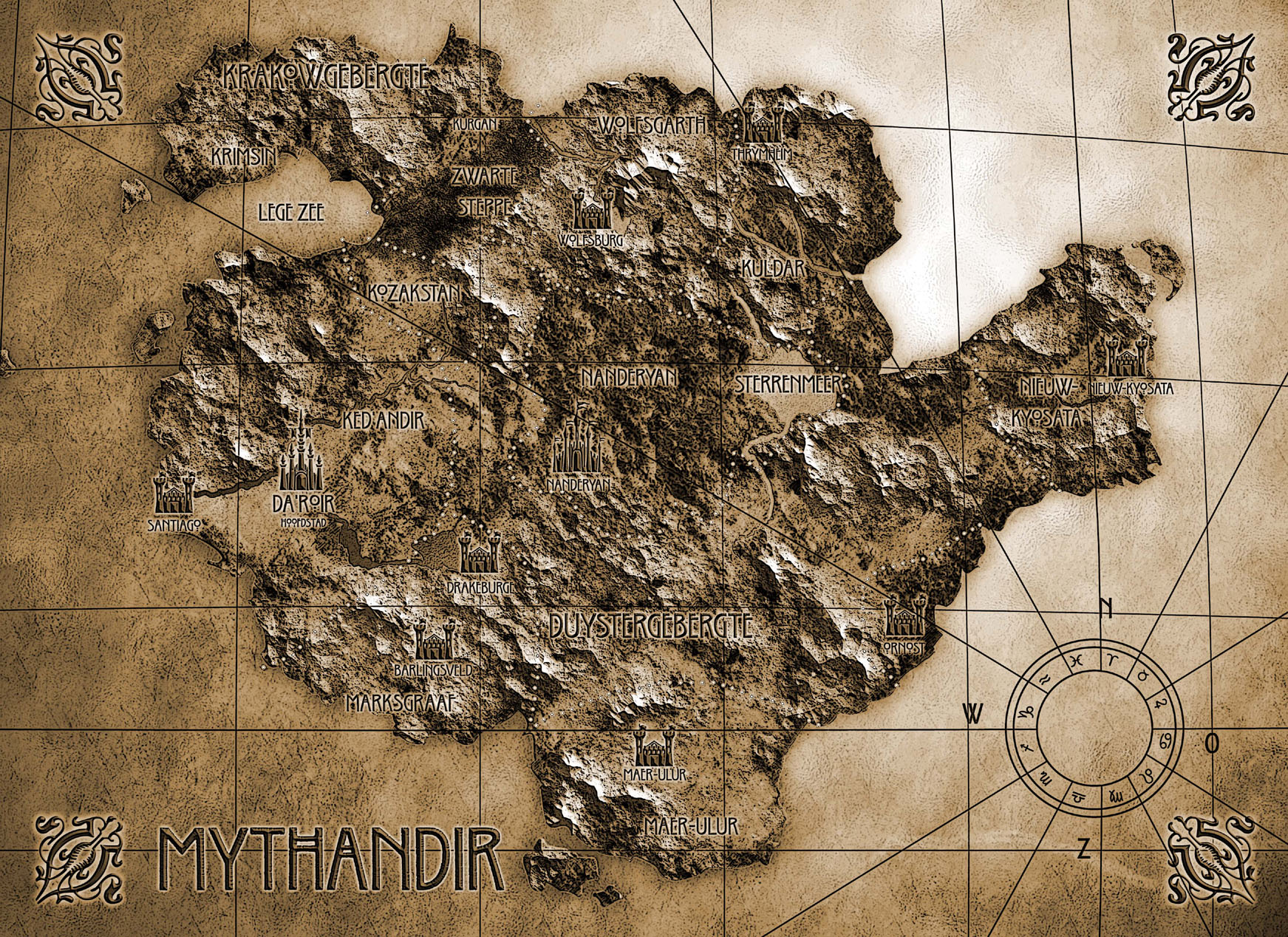 de meesten nog niet verkend zijn. De reeds gekende landmassa's zijn Kyosata, Antuïlestyr en de bakermat van de Daergon, een warm continent ergens ver ten zuiden van Mythandir. Hyoscyama, ook wel de Groene Hel genoemd vanwege haar tropische jungles, werd pas recent ontdekt door de Ked'Ari, expedities worden uitgezet.
